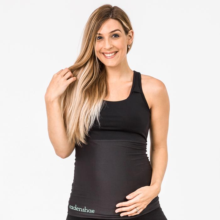 Breastfeeding mum in a striped nursing sports bra for high impact